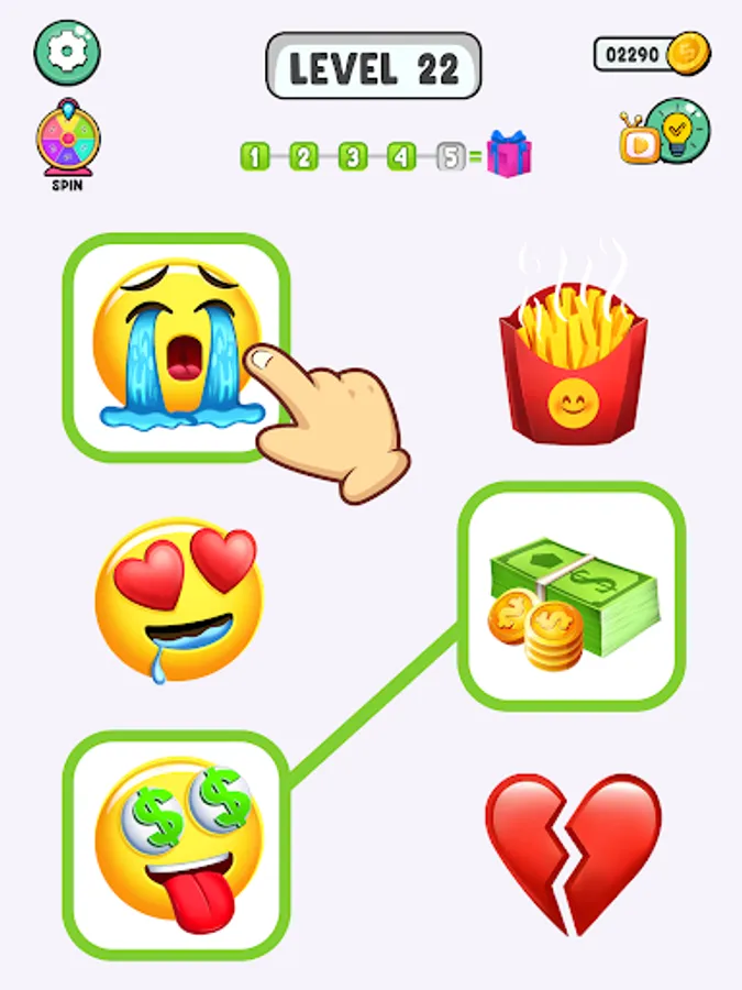 Connect the Emotions. Draw the line to connect multiple elements from different rows. Complete the levels by matching the emoji correctly and level up the ranks in this emoji puzzle brain games. Test your brain by matching multiple icon and finding relation of elements. Think and accomplish the challenges in this emoji puzzle: match the icon. Variety of levels and fun oriented emoji will amuse the users to play this addictive emoji puzzle game. Train your imagination with logical thinking and become emoji puzzle matching game.