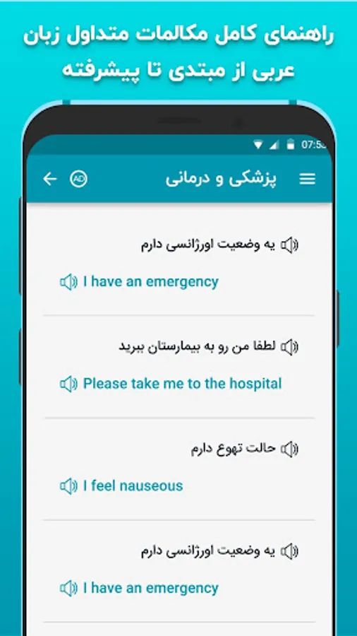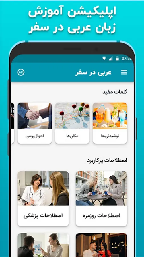 The comprehensive Arabic language travel program is known for its simplicity in using the menu as well as the pronunciation of each word and its meaning. You can use this application to increase your Arabic vocabulary and use it in different situations.
