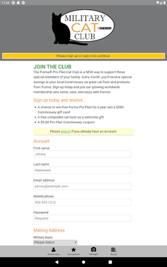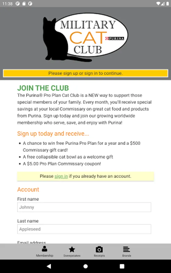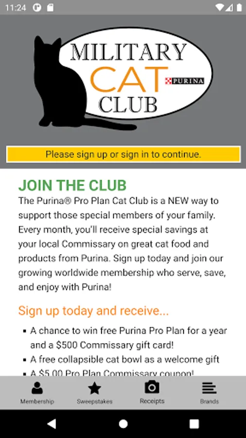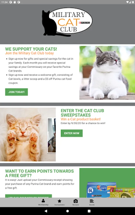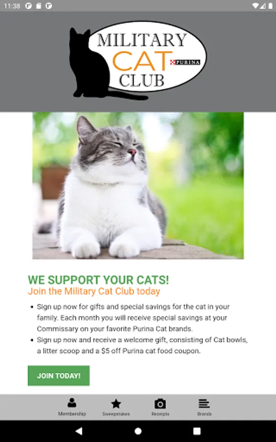 Sign up now for gifts and special savings for the cat in your family. Each month you will receive special savings at your Commissary on your favorite Purina Cat brands. Receive a welcome gift, consisting of Cat bowls, a litter scoop and a $5 off Purina cat food coupon.