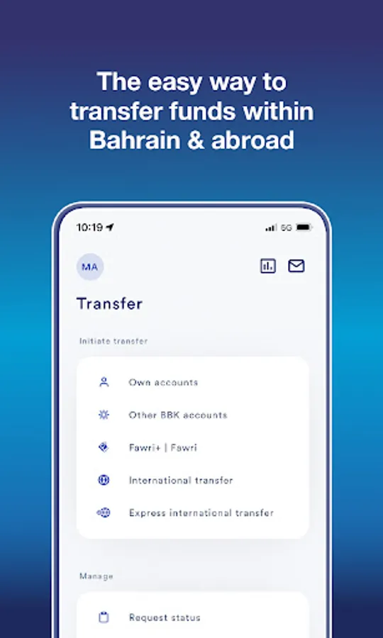 • Using mobile number or IBAN, transfer funds to any other local account in Bahrain through Fawri+ and Fawri
