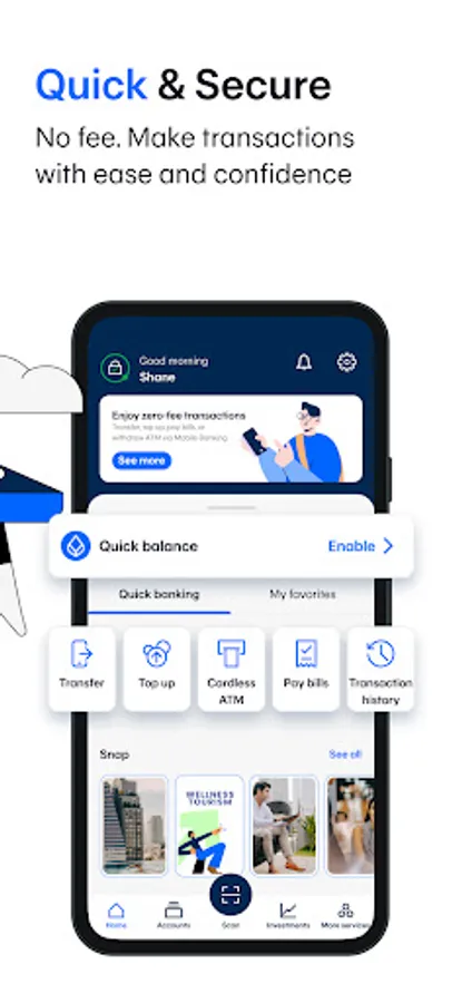 • Pay no fees on any transfer, top up, or bill payment, and set your daily transfer and payment limits up to 2 million baht