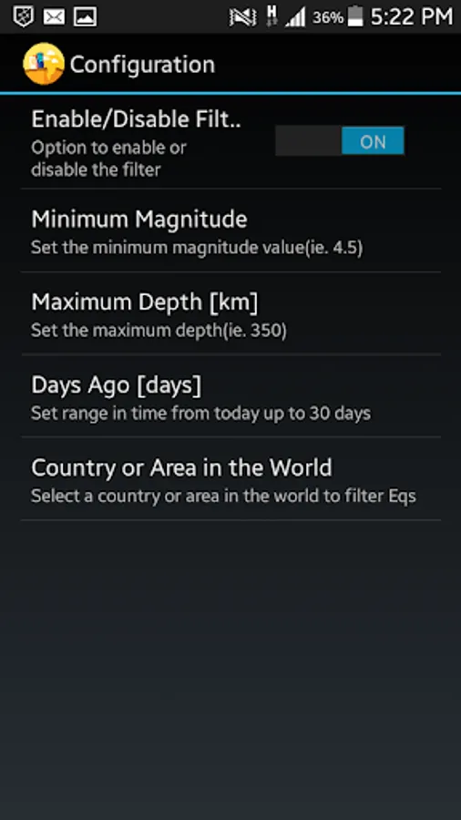 This app has a settings option to filter the information by magnitude, depth, country or geographical areas and the number of days.