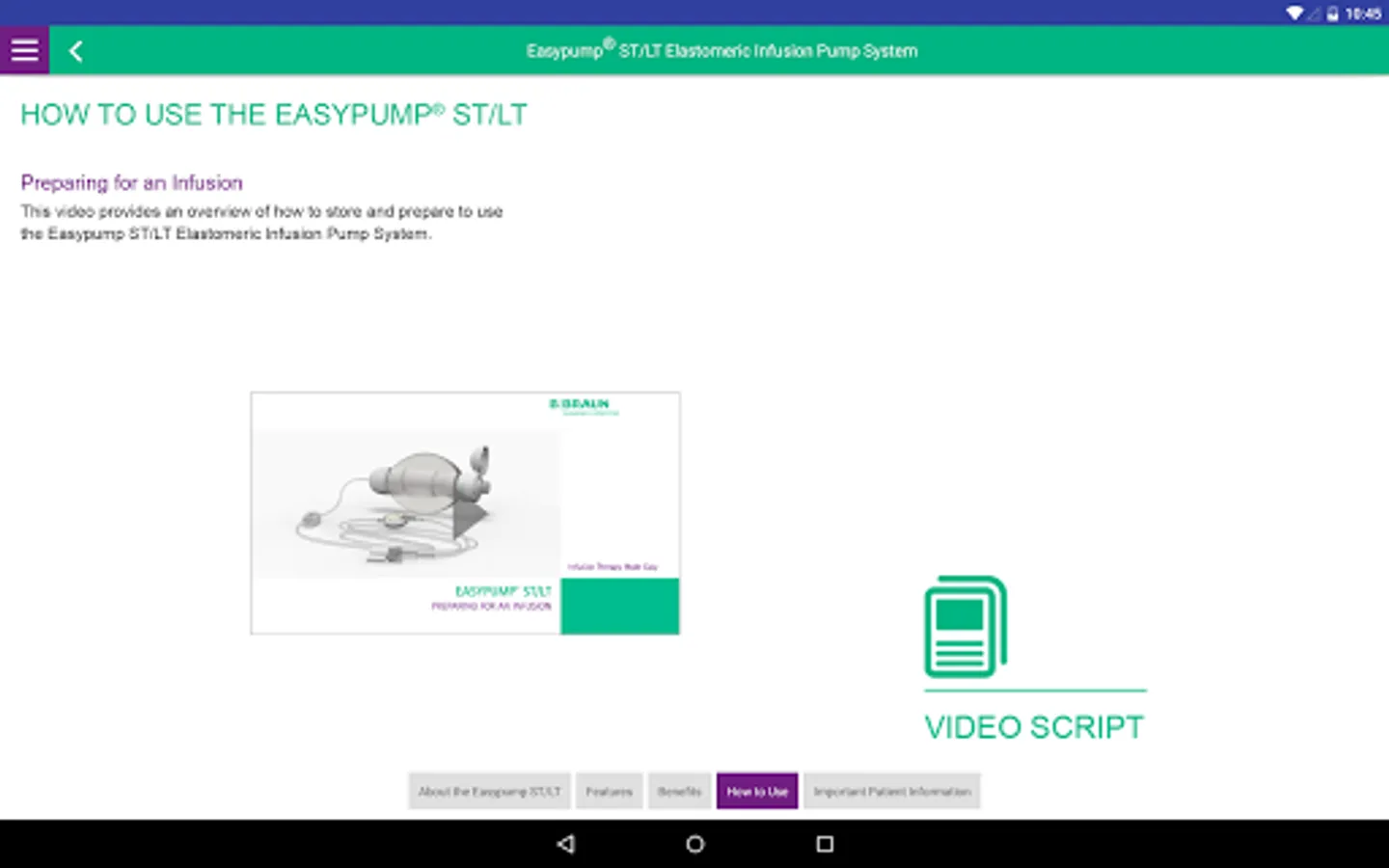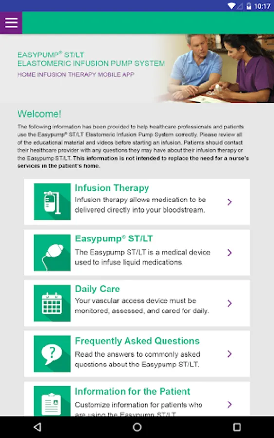 This Home Infusion Therapy mobile app is provided to help healthcare professionals and patients use the Easypump(R) ST/LT Elastomeric Infusion Pump System correctly. It provides educational materials and videos, helping to ensure a safe infusion from start to completion. Patients should contact their healthcare provider with any questions they have about their infusion therapy or the Easypump ST/LT. The information herein is not intended to replace the need for a nurse's services in the patient's home.