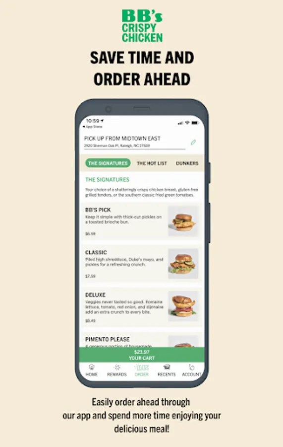Order ahead. Skip the line. BB' rewarded with each purchase. The BB's Crispy Chicken app gives you shatteringly crispy chicken at your fingertips. Making ordering easy—your choice of grab 'n' go, curbside, and delivery all available. Convenience is our core, but quality ingredients and chef-crafted recipes are the special sauce.