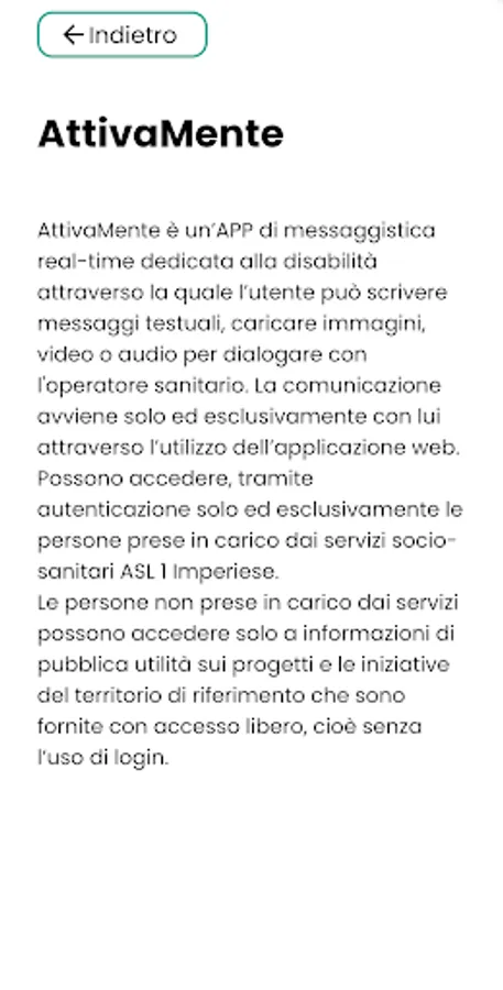 AttivaMente is a real-time messaging APP dedicated to disabilities through which the user can write text messages, upload images, videos or audio to dialogue with the healthcare professional. The communication takes place only and exclusively with him through the use of the web application. Only and exclusively people taken care of by the ASL 1 Imperiese social and health services can access through authentication. Persons not taken care of by the services can only access information of public interest on projects and initiatives in the reference area which are provided with free access, i.e. without using a login.