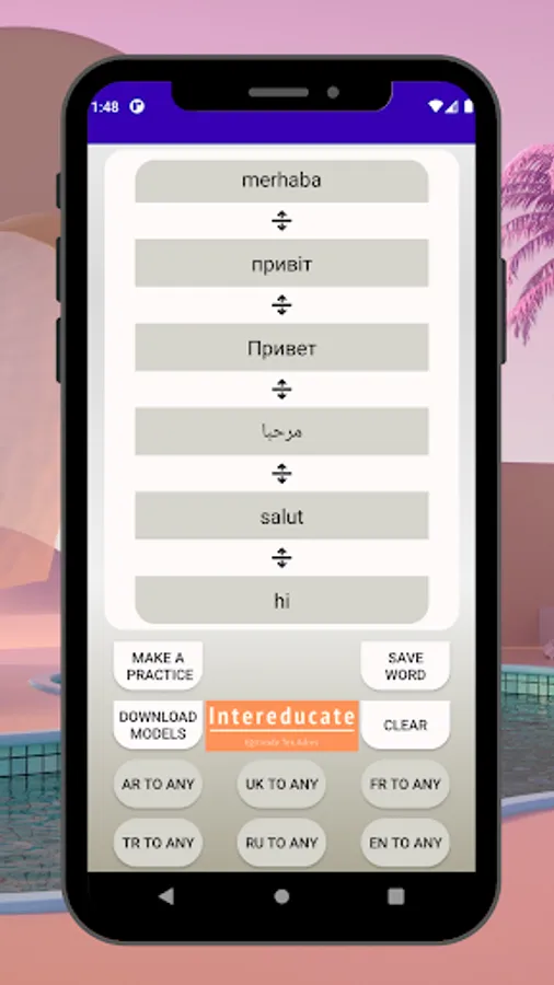On this app you can translate and learn between Turkish English Russian Ukranian Arabic French.You can save words and practice.After the insallition you should download models, downloading proccess can see at notification window.When download process done you should restart app.Then application ready for use.Be fast and Learn.