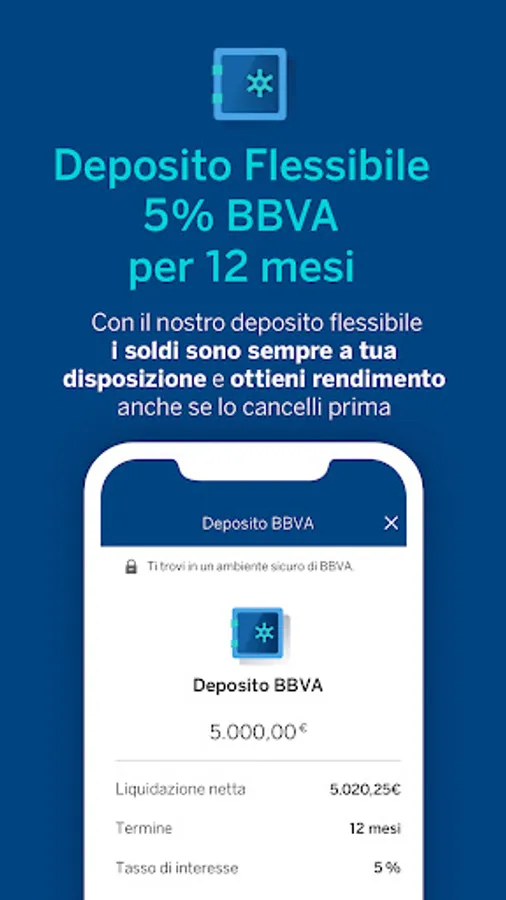 With BBVA Flexible Deposit 5% gross for 12 months you can secure your savings and if you cancel it sooner you will receive 1% gross on the amount deposited. It has no opening or management costs.