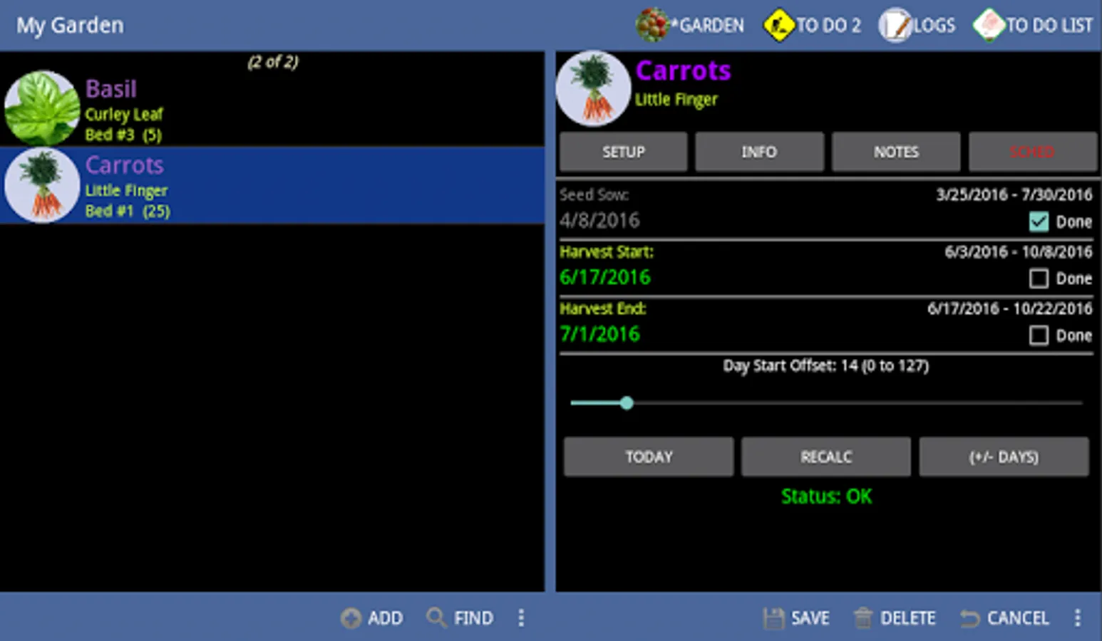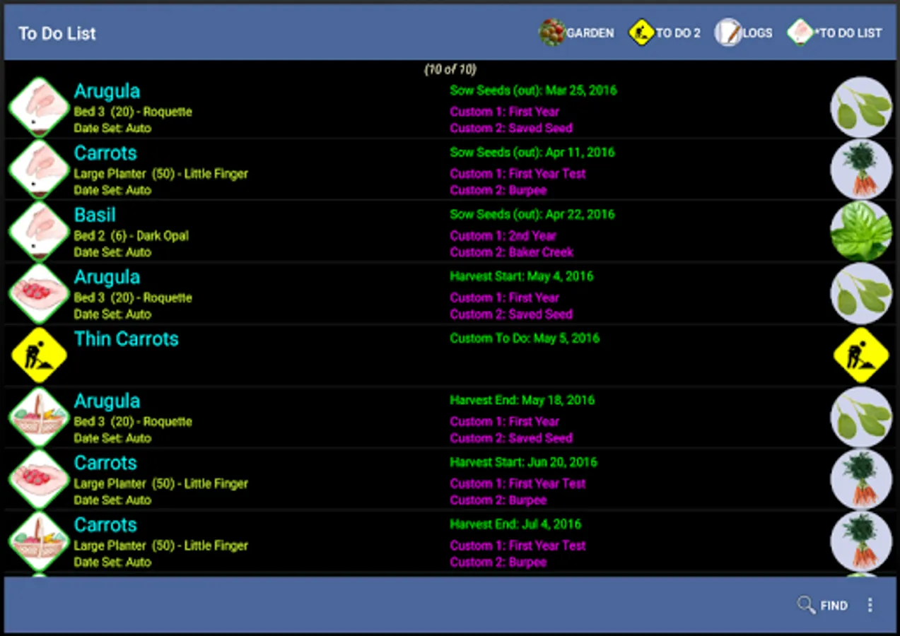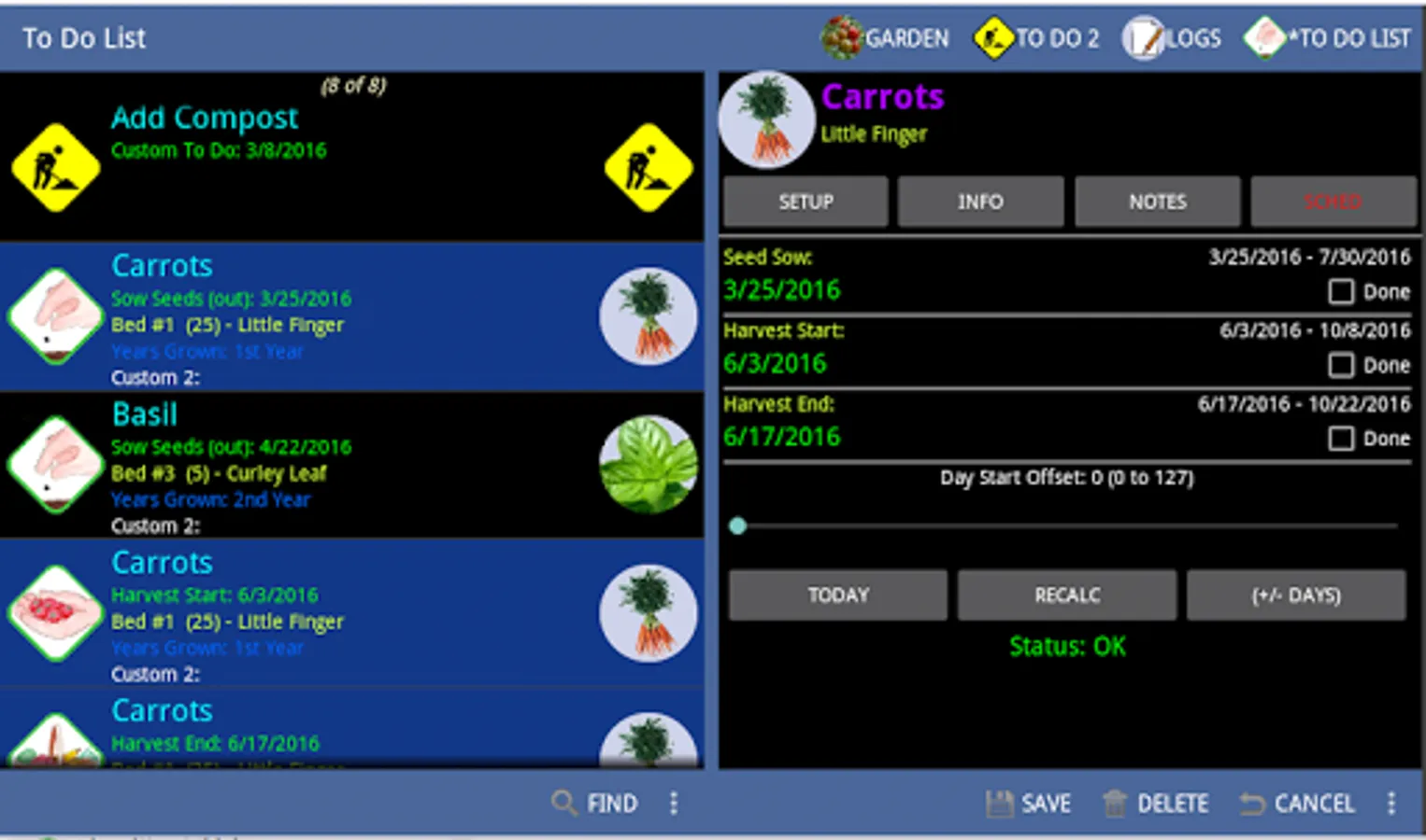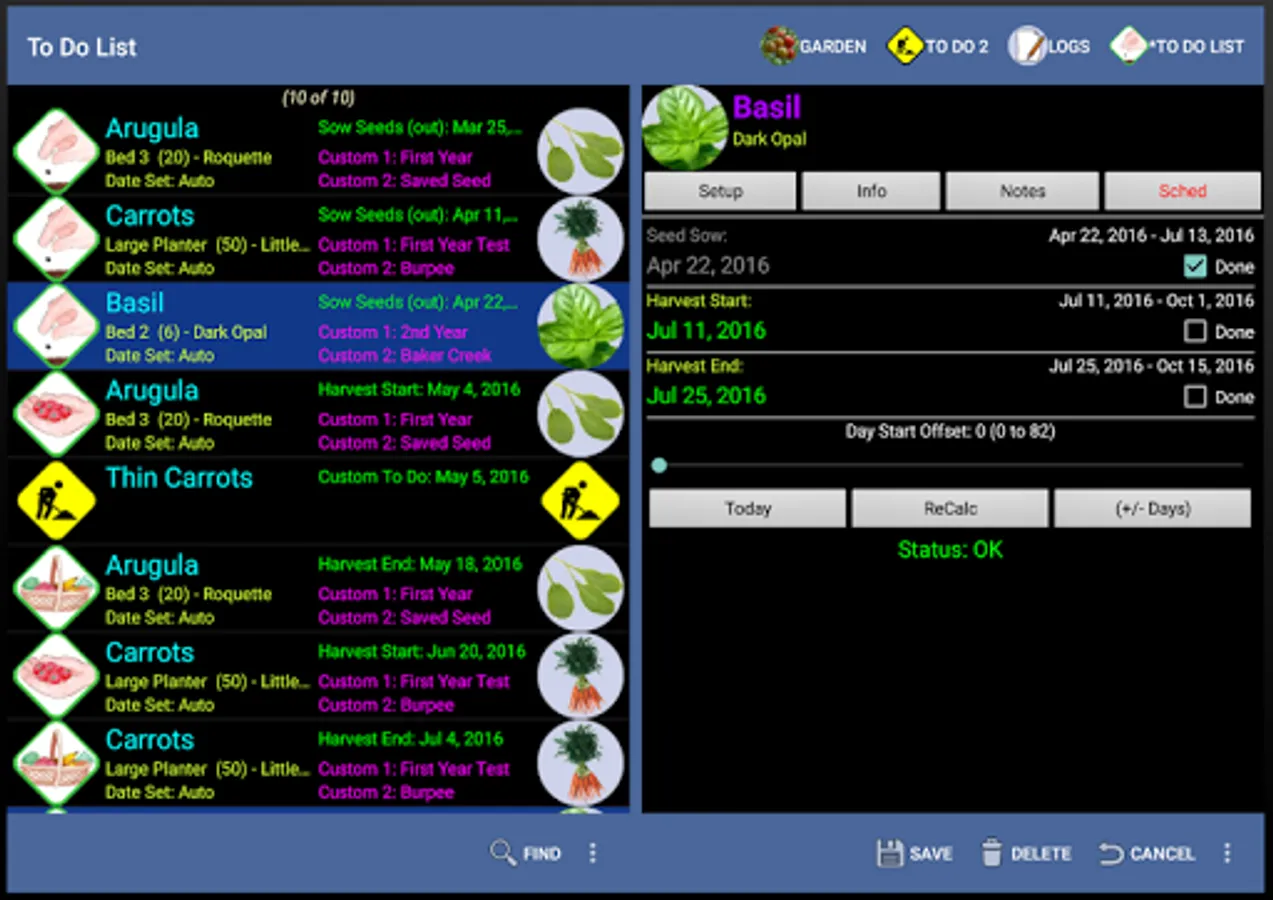Create your own personal garden to do list. Garden Time calculates for you the suggested dates (based on frost dates you specify) of when to sow your crops, either from seed or plants, when to transplant them into the garden, and when to begin and end harvesting for each selected crop.