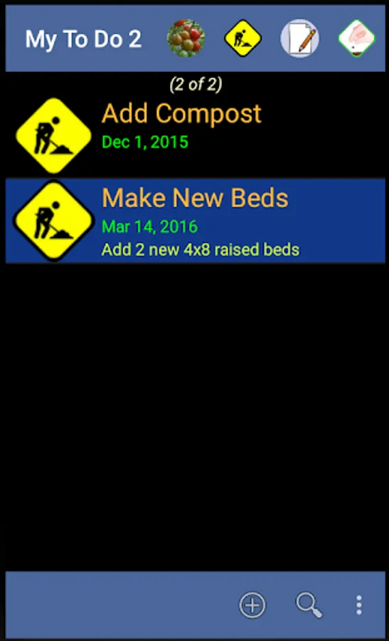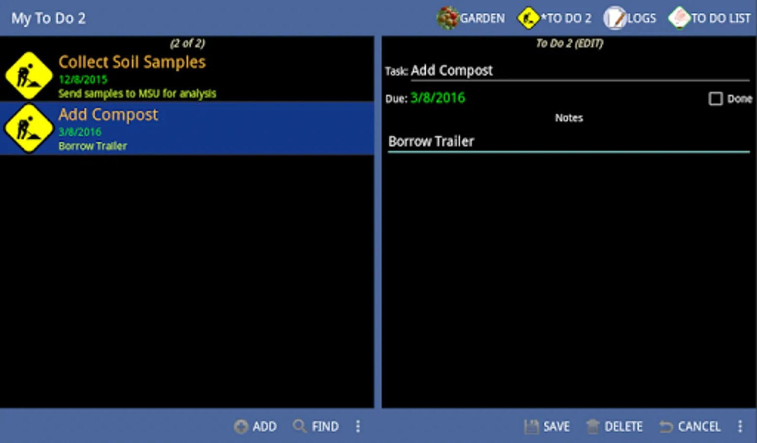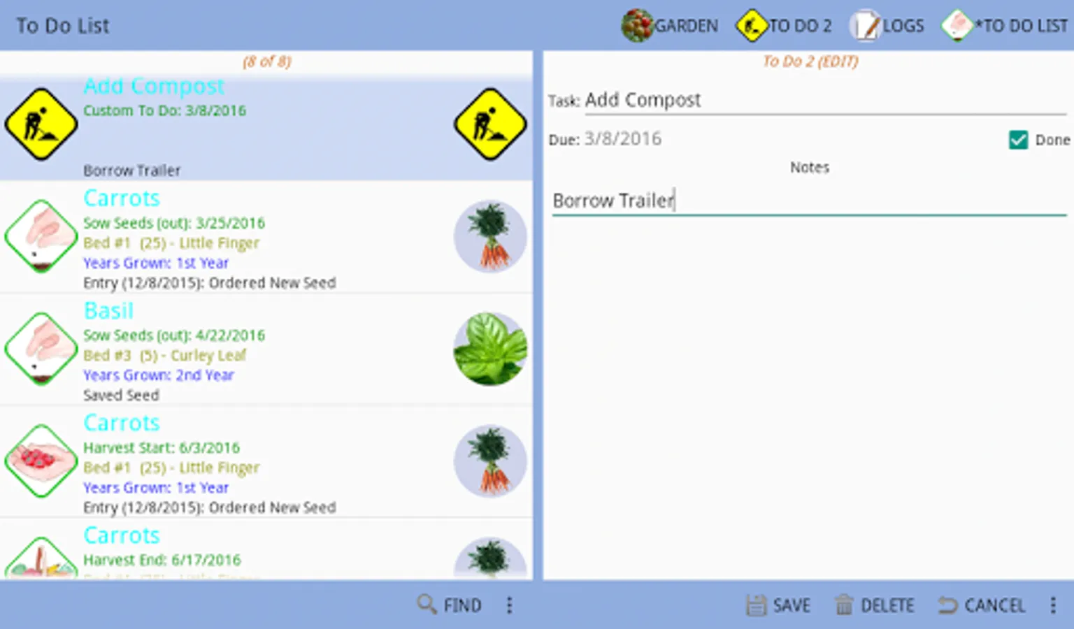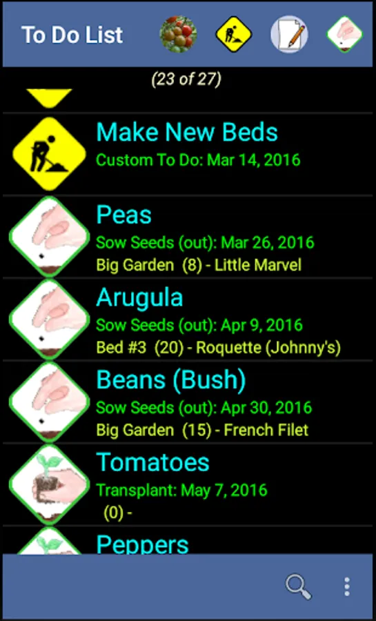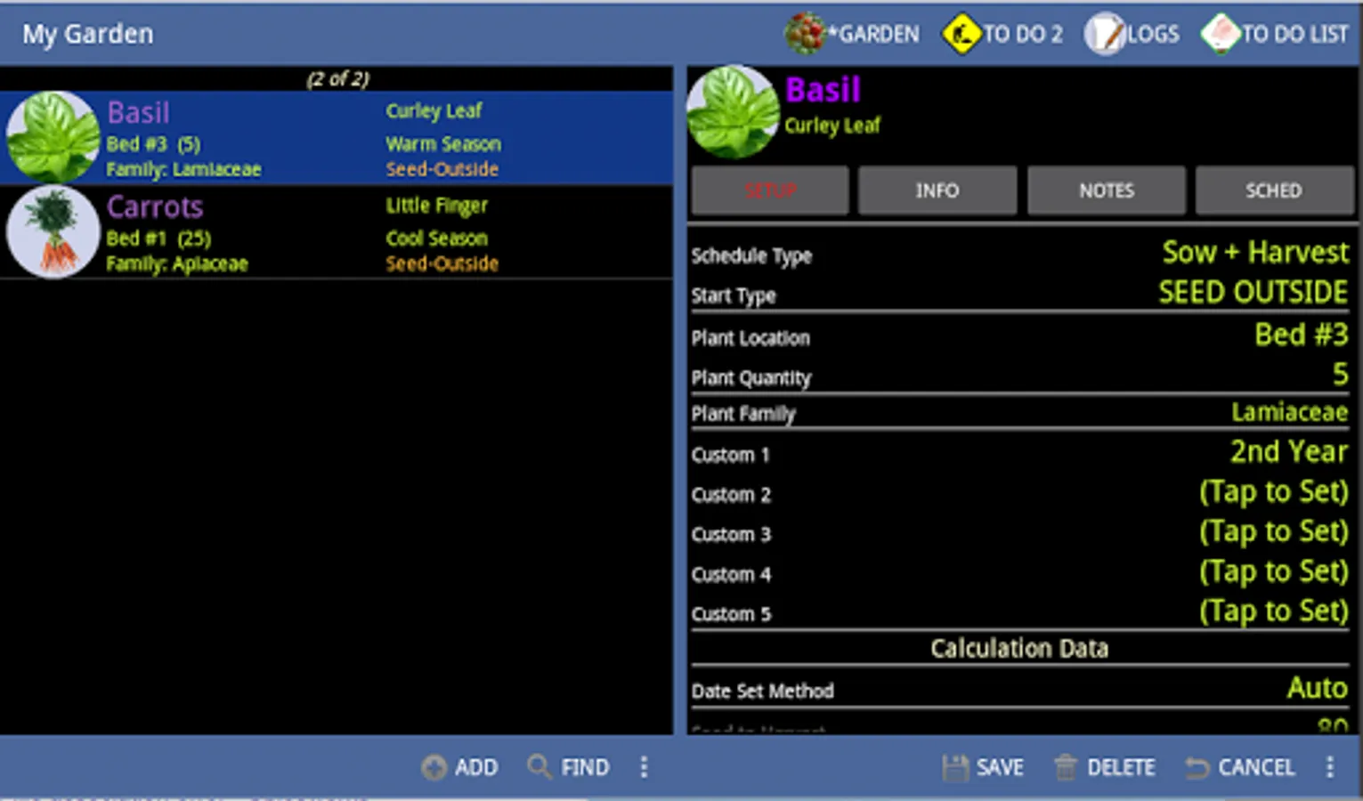 Create your own personal garden to do list. Garden Time calculates for you the suggested dates (based on frost dates you specify) of when to sow your crops, either from seed or plants, when to transplant them into the garden, and when to begin and end harvesting for each selected crop.