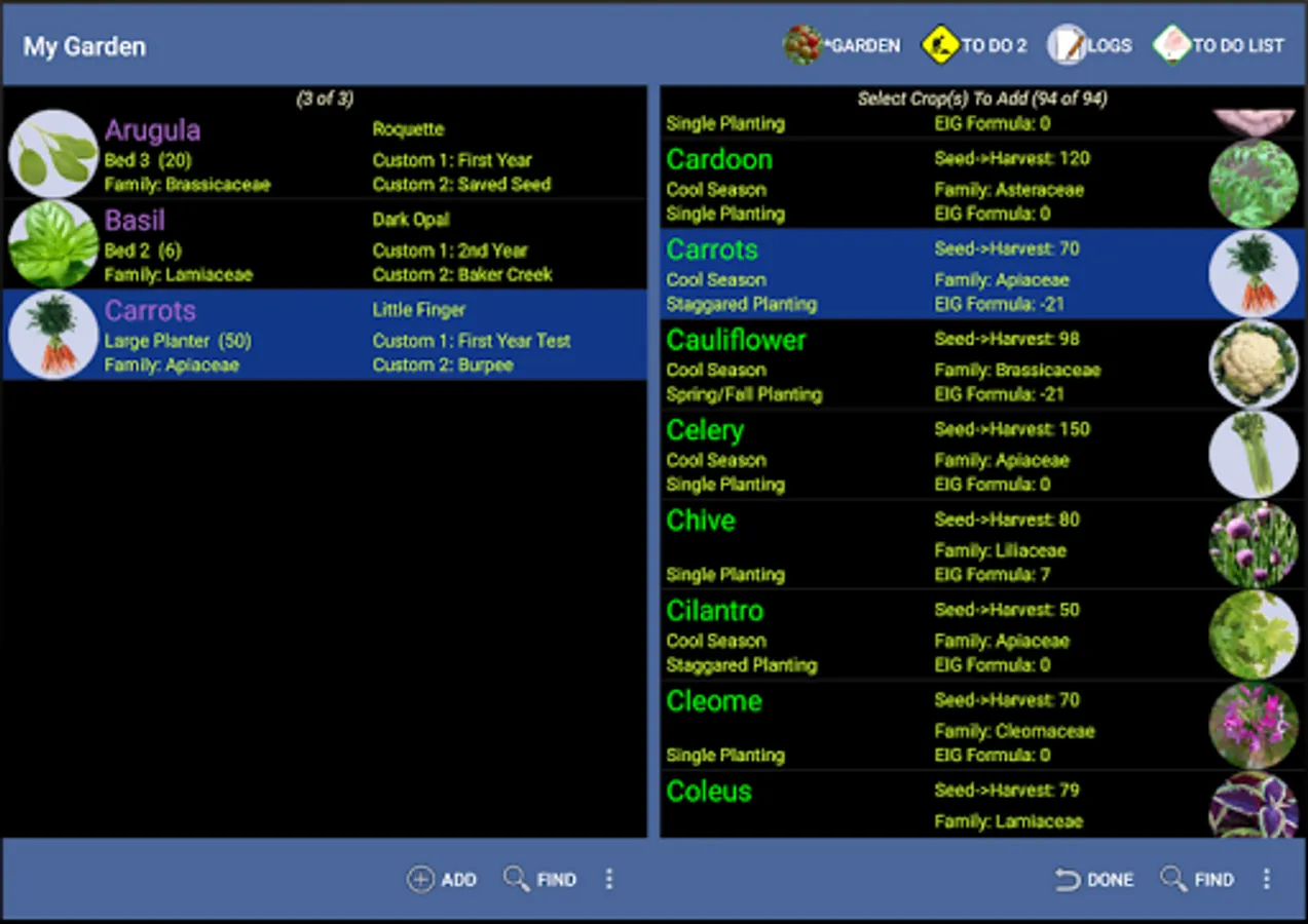 ✔ Multiple crop display and sorting options to help you view things like crop family, days to maturity, season and planting preferences.