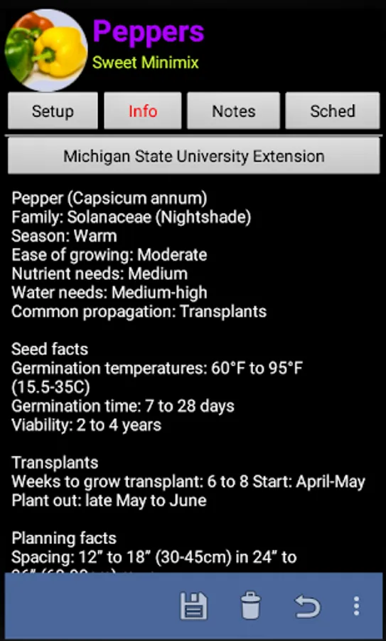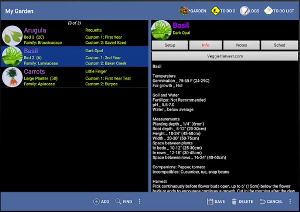 ✔ Useful crop information from multiple selectable sources including VeggieHarvest; (http://www.veggieharvest.com/), Southern Exposure, and a couple University Extensions.