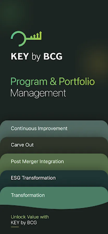 A successful transformation or change program requires unparalleled transparency —from initial design through execution. KEY by BCG, our portfolio and program management software, helps companies unlock value and manage complexity through every phase of their transformation.