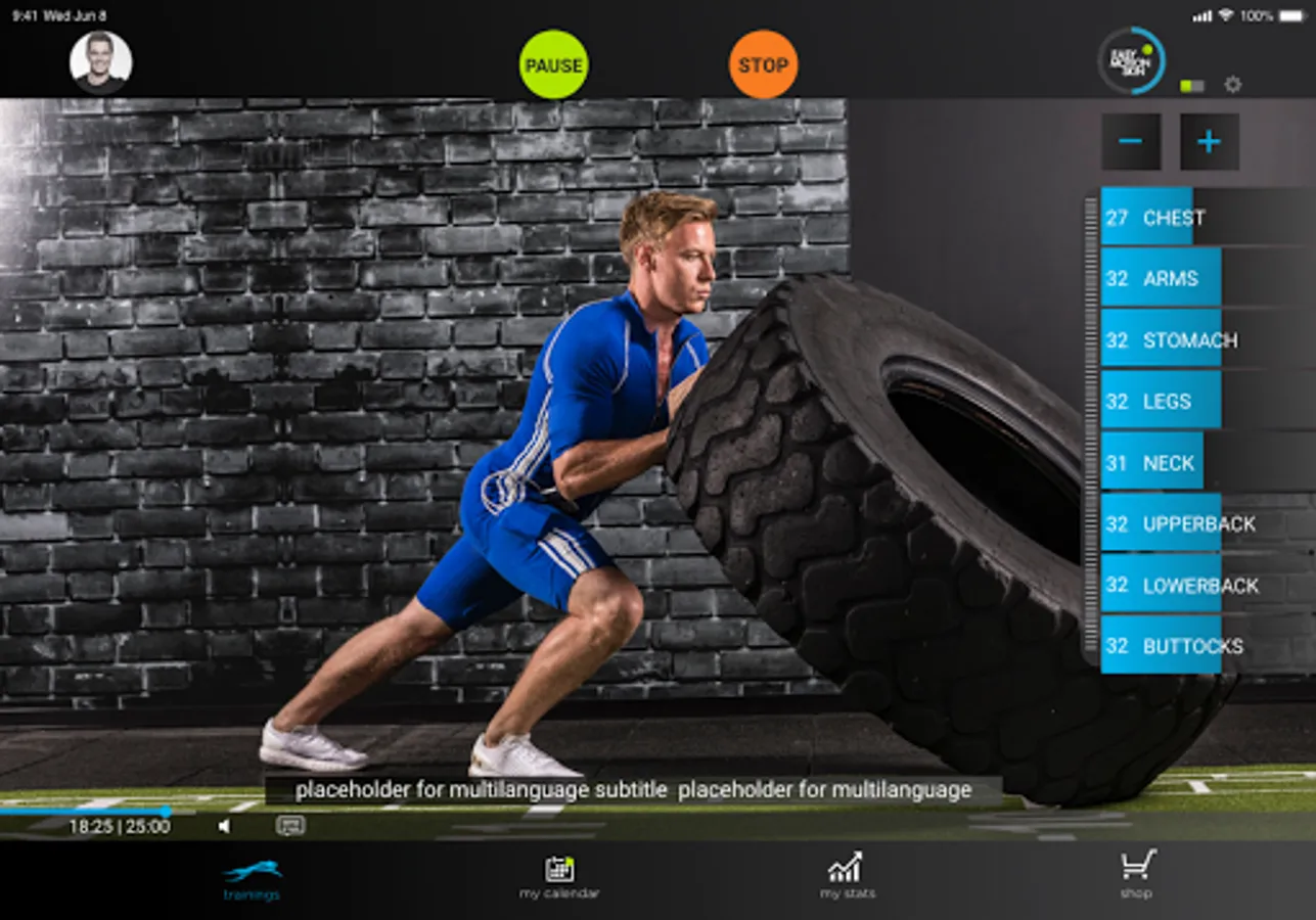 The BodyClub app has video training programs that can be carried out with the Easy Motion Skin System. The frequencies of the training are related to the video and automatically changes from 7 Hertz frequency (strength training), 40 Hertz (endurance training), 85 Hertz (power training) and 100 Hertz (relaxation training). The athlete is shown his scores and can use the calendar to organize his trainings at home and in the BodyClub studios. The Easy Motion Skin System is required.