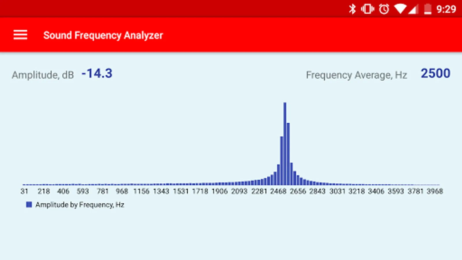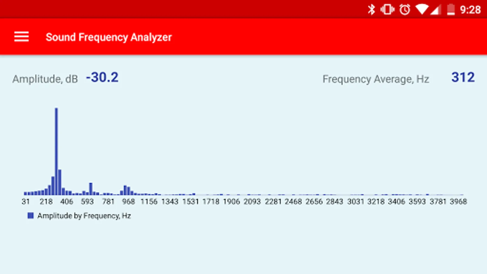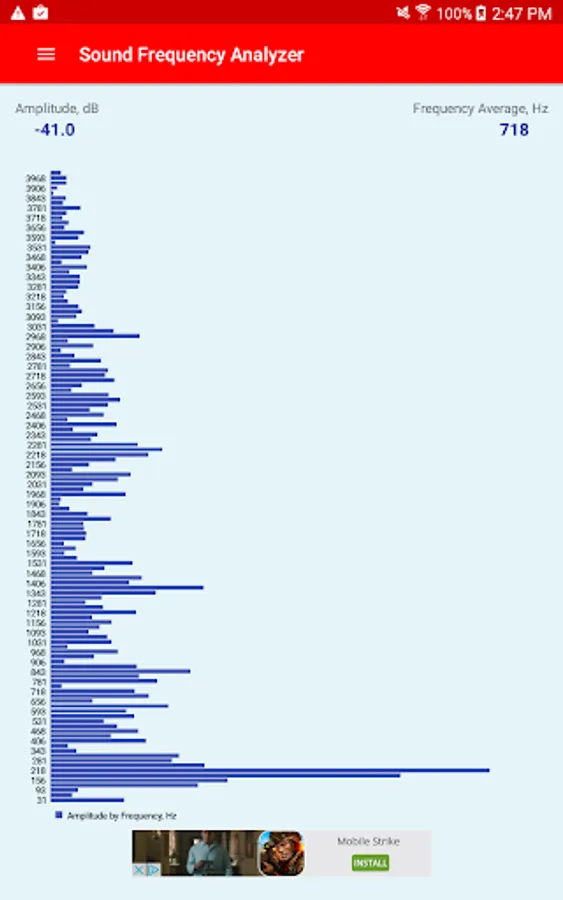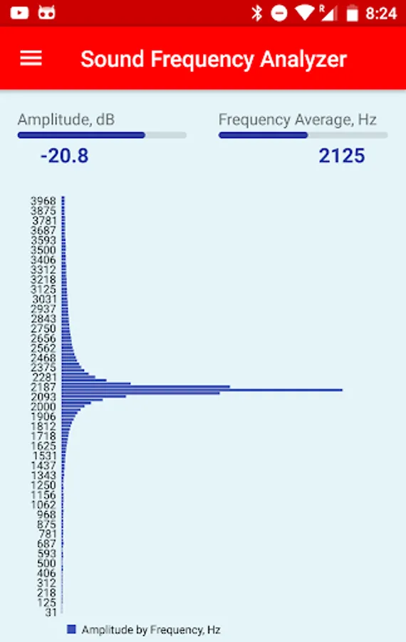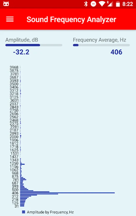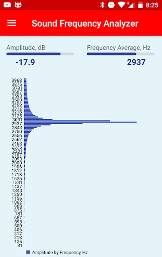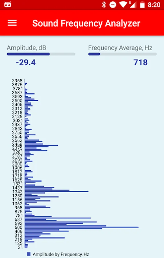 The Sound Frequency Analyzer app analyzes the audio spectrum of the sound in real time, showing the sound amplitude in dB(decibel), average frequency in Hz(Hertz), as well as displays the graphical view of the amplitude for each frequency in the spectrum.