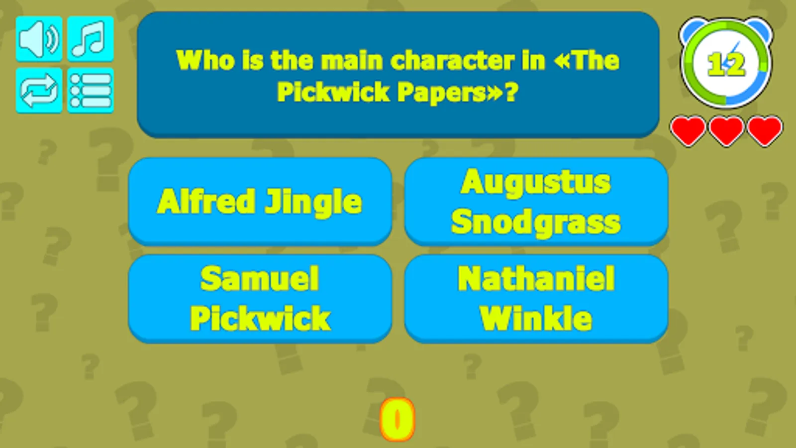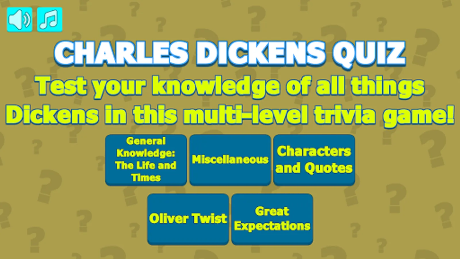 Navigate your way through five categories; General Knowledge: The Life and Times, Miscellaneous, Characters and Quotes, Oliver Twist, and Great Expectations. In each category, you’ll select multiple choice answers to questions ranging from Easy to Difficult, scoring points for each correct answer as you proceed.