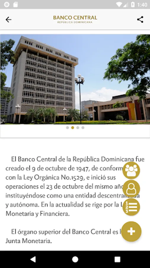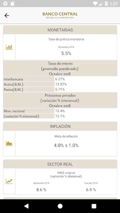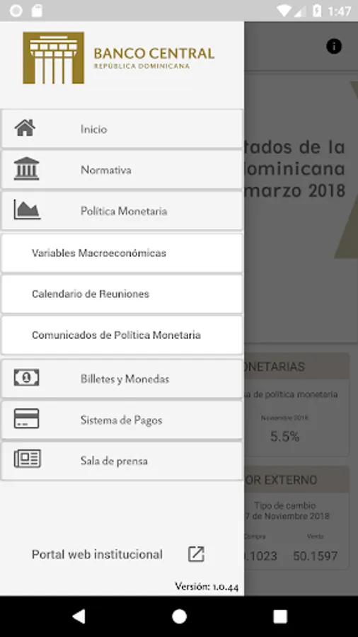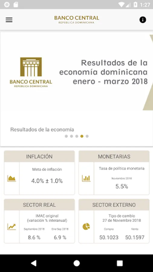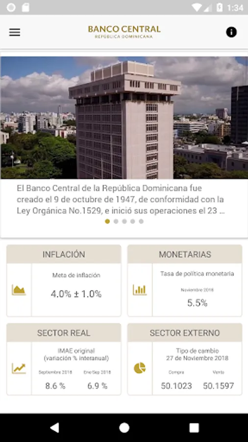 This application allows you to consult the main macroeconomic indicators and monetary policy, news and news, information on the payment system, notes and coins, as well as the current documents and regulations published by the Central Bank of the Dominican Republic.