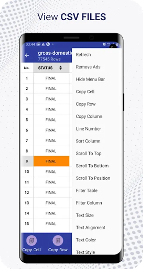 CSV File Reader or CSV File Viewer is an app to view and read csv files (Comma-Separated Values) on your Android smart phone. With this Csv opener app, now it is easy to view Csv files on your smart phone. Now you do not need any Laptop or PC to view CSV files, this Csv file viewer app can help to view and scroll through all CSV files present in your smart phone.