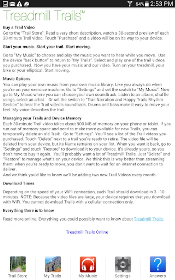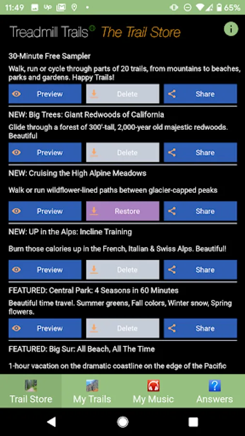 99 cents for each 30-minute video. Yours forever. On your phone or tablet. Preview and download some right now in the free Treadmill Trails app.