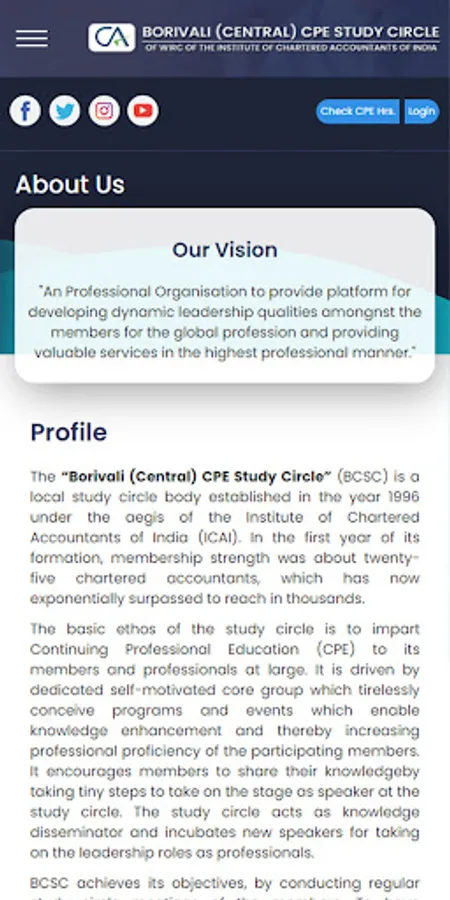 The “Borivali (Central) CPE Study Circle” (BCSC) is a Study circle body established in the year 1996 under the aegis of The Institute of Chartered Accountants of India (ICAI). It’s a Professional Organization to provide platform for developing dynamic leadership qualities amongst the members for the global profession and imparting knowledge & providing valuable services to its members in the highest professional manner."