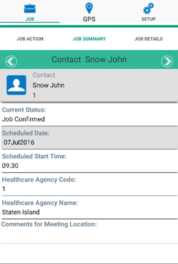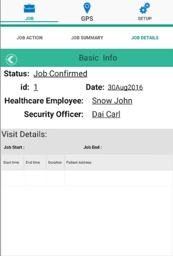 This App is used by Security Officers who escort HealthCare Employees when they visit patients at their homes in unsafe areas. The App allows the Security Officer to check in and check out with the Head Office Security Dispatch to confirm that they are present to escort the HealthCare Employee at the beginning and end of their shift of patient visits. The Security Office is required to use the App to record the beginning and end of each patients visit to collect the durations of the visits for accounting and billing purposes. The GPS coordinates are recorded at various times during the shift to track the progress, route and locations of the Security Officers and the HealthCare Employees. The GPS coordinates are resolved into street addresses to capture the patient addresses for verification and billing purposes.