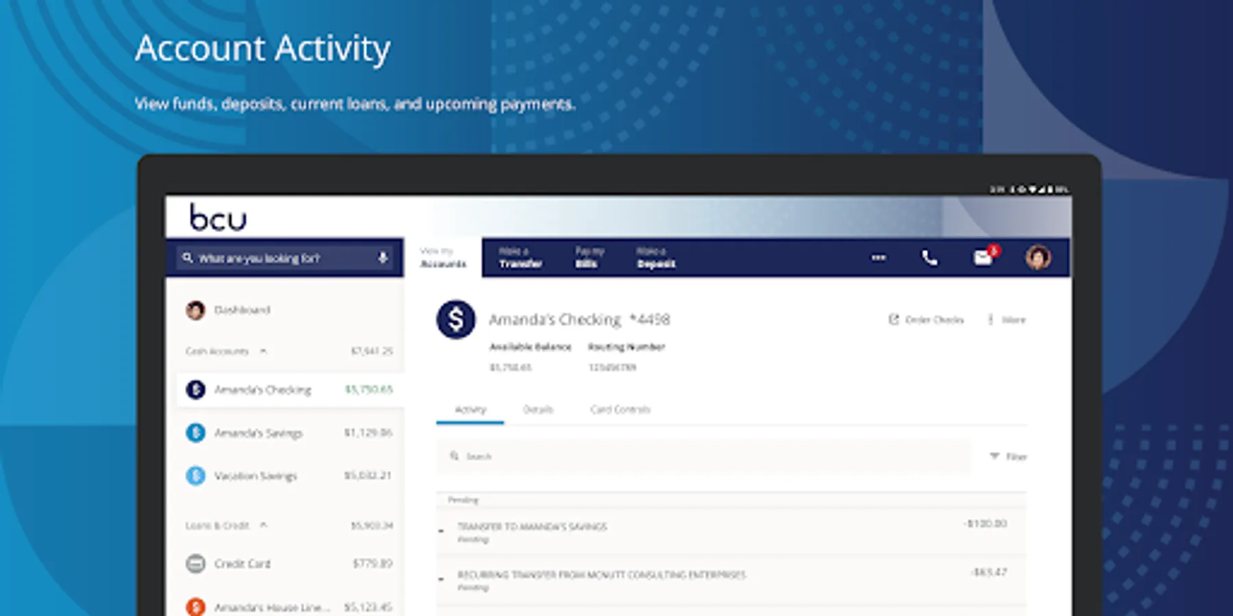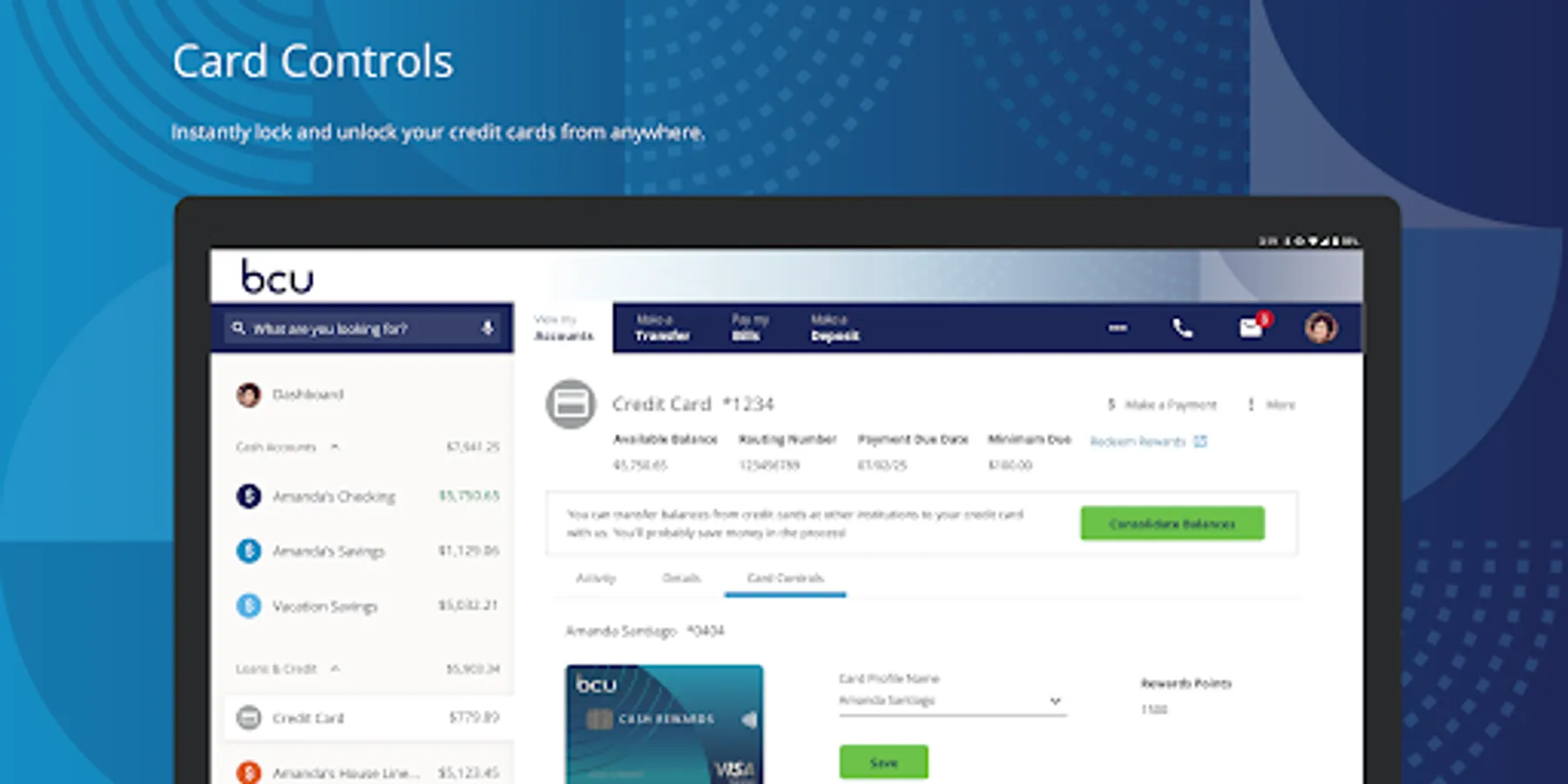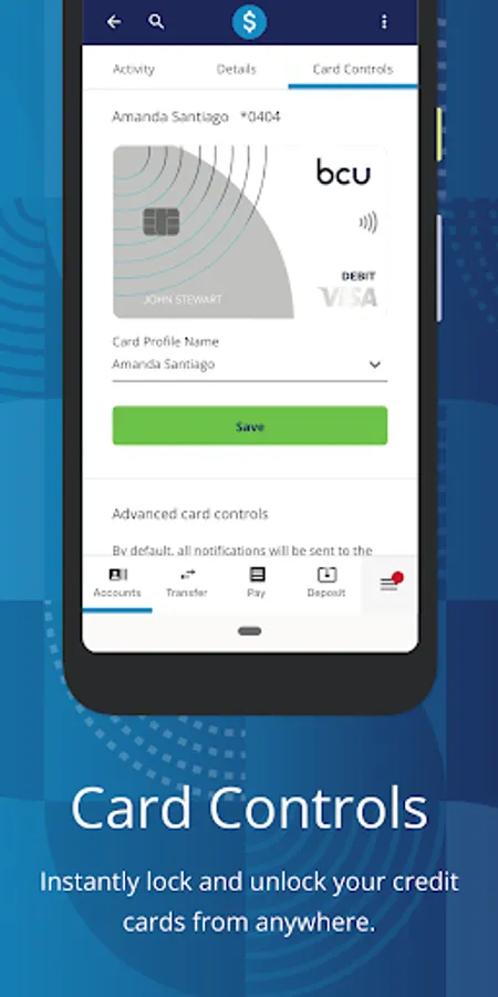 • Card Controls & Alerts – Lock and unlock credit and debit cards, set up transaction alerts, travel notifications, and more.
