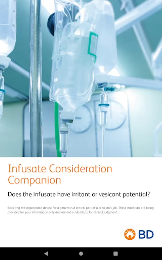 How much do you know about infusates and infusion complications? When selecting a vascular access device, are you considering everything you should be? Thrombosis, thrombophlebitis, phlebitis, necrosis following extravasation of a vesicant drug, and pain/redness during infusion may be potential complications. The BD Infusate Consideration Companion (ICC) may help you identify medications that are non-peripherally compatible. Consideration of peripheral vein preservation and minimizing harm should be a factor in device selection. Selecting the appropriate device for a patient is a critical part of a clinician’s job. These materials are being provided for your information only and are not a substitute for clinical judgment.