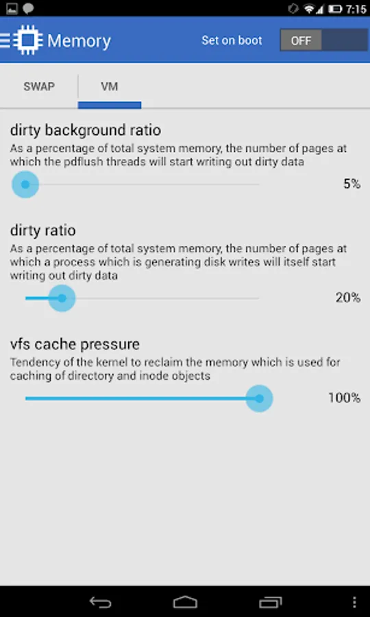 * set dirty_background_ratio, dirty.ratio and vfs_cache_pressure