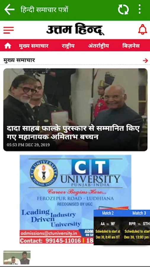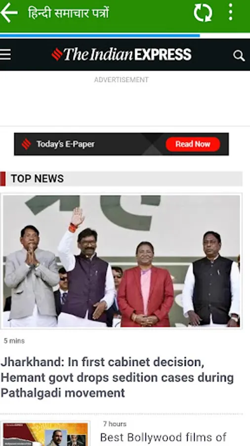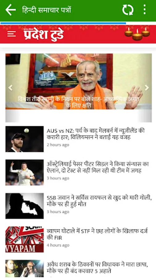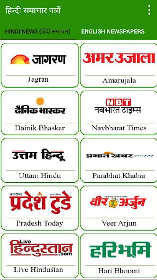 dainik jagran (dainik jagran is an indian hindi language daily newspaper.), amarujala (amar ujala is a hindi-language daily newspaper published in india. it has 21 editions in six states and two union territories covering 179 districts.), dainik bhaskar (dainik bhaskar is an indian hindi-language daily newspaper that is the largest circulated daily newspaper of india.), navbharat times (navbharat times is one of the largest circulated as well as largest read hindi newspapers of delhi and mumbai and lucknow.), uttam hindu (uttam hindu:north india's leading hindi newspaper.), parabhat khabar (prabhat khabar is a hindi language newspaper published daily in jharkhand, bihar and west bengal. the newspaper is circulated in several states in india, including bihar, jharkhand, west bengal and some parts of orissa.), pradesh today (pradesh today newspaper cover all types of news . you can read madhya pradesh local news (bhoal) via just click on the thumbnail of the news paper.), veer arjun (veer arjun e-paper a leading hindi newspaper providing latest news on ntion, regional, politics, sports,entertainment and more.), live hindustan (newspaper official channel, which covers latest news in hindi on politics, sports, career, jobs, business, entertainment.), hari bhoomi (hari bhoomi is a daily newspaper published in north and central india.), patrika (rajasthan patrika is an indian hindi-language daily newspaper.), panjab kesari (punjab kesari is a hindi-language newspaper published from many centres in punjab, haryana, rajasthan, himachal pradesh and delhi in india.) sanmarg (hindi news:get breaking news in hindi,latest hindi news and hindi news headlines.), deshbandu (deshbandhu is a hindi newspaper. it was launched in april 1959 from raipur, now capital of chhattisgarh, by veteran journalist mayaram surjan.