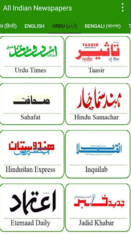 Etemaad Daily is an Urdu newspaper and providing Online news in English and Urdu based in Hyderabad, Telangana. Jadid Khabar is an Urdu Newsportal covering National, International, Local, Artilces in Urdu Language. Taasir is a multi-edition Indian Urdu daily newspaper. Urdu Times is a free Urdu newspaper from New York.