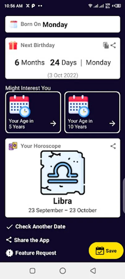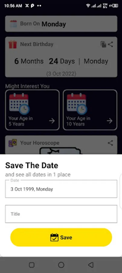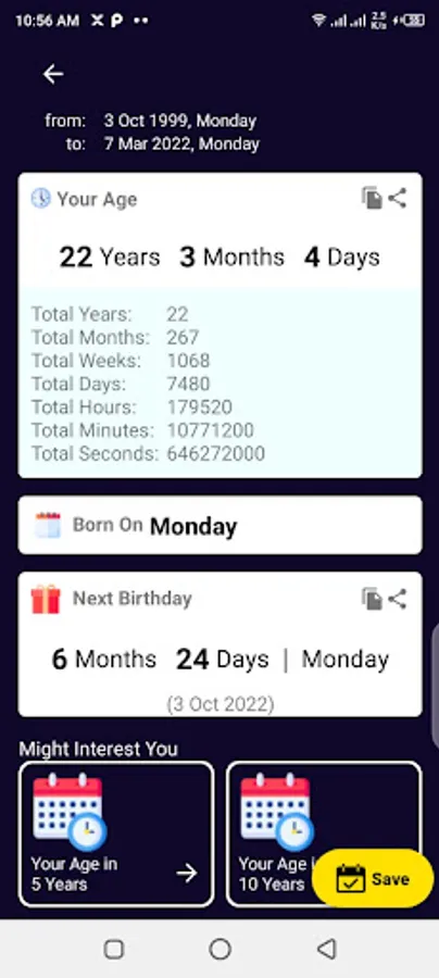 The question of "how old are you?" is often asked, and the answer requires some mental calculation. With this app, you can calculate your exact age. The only thing you have to do is enter the accurate date of birth, and the result will display the next birthday age.There is also a special segment in the result category that indicates how many seconds, minutes, hours, days, weeks, months, and years you have lived.