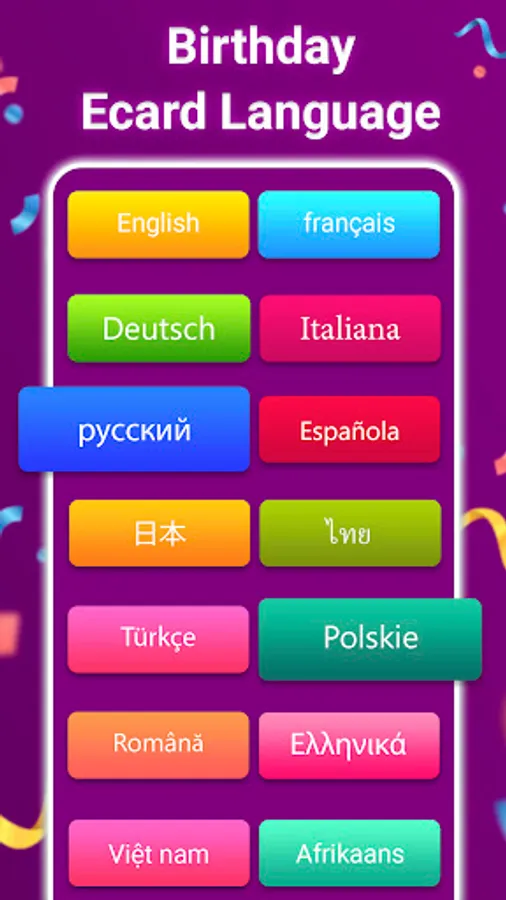 Select birthday invitation card in different languages like English, Hindi, Spanish, Japanese, Portuguese, Russian, Italian, French, German, and Malay. It also contains birthday greeting card of Indian languages like Marathi, Bengali, Gujarati, Punjabi, Malayalam, Kannada, Tamil and Telugu etc. Making online bday card with our birthday greeting card maker is extremely easy and multilingual!