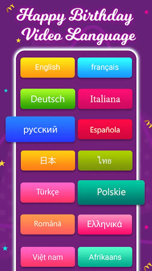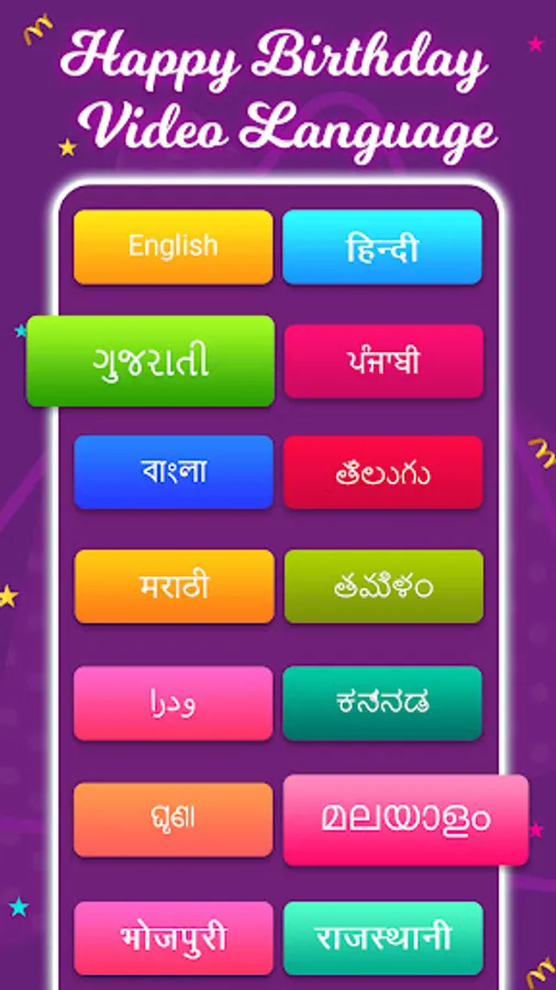 Select happy birthday songs in different languages like English, Arabic, Spanish, Japanese, Portuguese, Nepali, Russian, Italian, French, German, and Urdu. It also contains happy birthday songs of Indian languages like Hindi, Gujarati, Marathi, Bengali, Gujarati, Rajasthani, Bhojpuri, Punjabi, Haryanvi, Malayalam, Kannada, Tamil, and Telugu, etc. Making a birthday video with our birthday slideshow maker is extremely easy and multilingual.