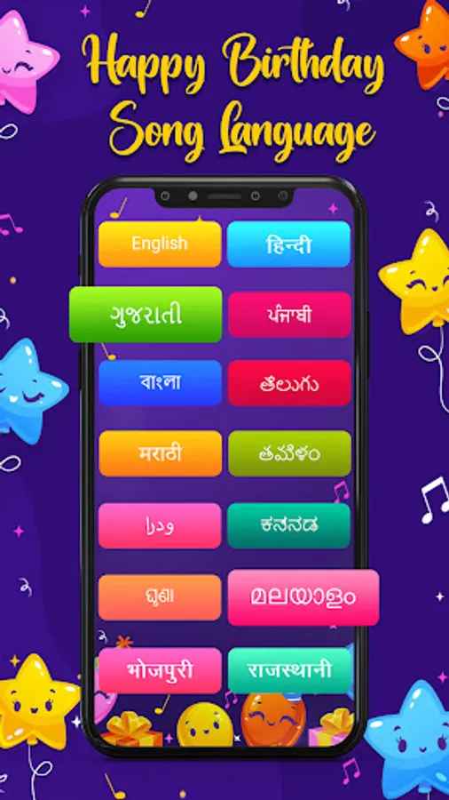 It also contains birthday songs of Indian languages like Hindi, Bengali, Gujarati, Kannada, Malayalam, Marathi, Punjabi, Tamil, Telugu, Rajasthani, Bhojpuri, Haryanvi and etc.