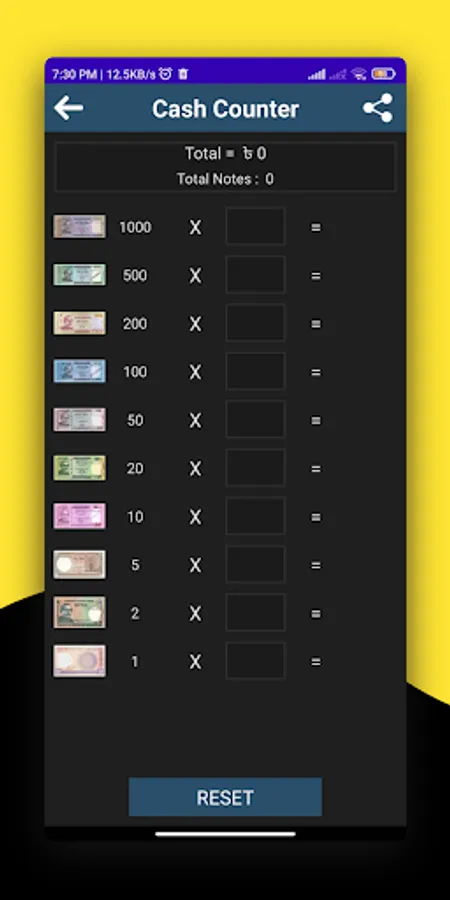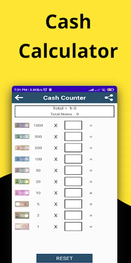 * For all our bank or other field staff who do the time-consuming calculations in counting and tallying different denominations of currencies. Using this app, you can easily tally your cash within a minute. Just put the number of notes of each denomination to get the total cash with the individual total of each denomination note.