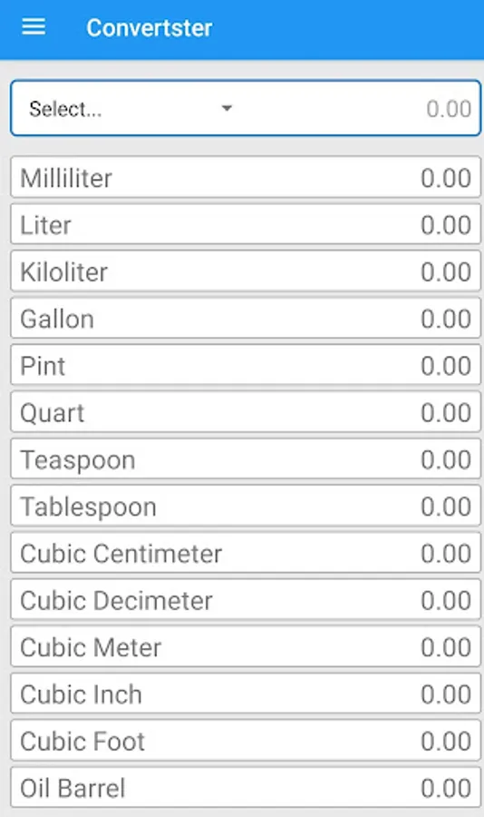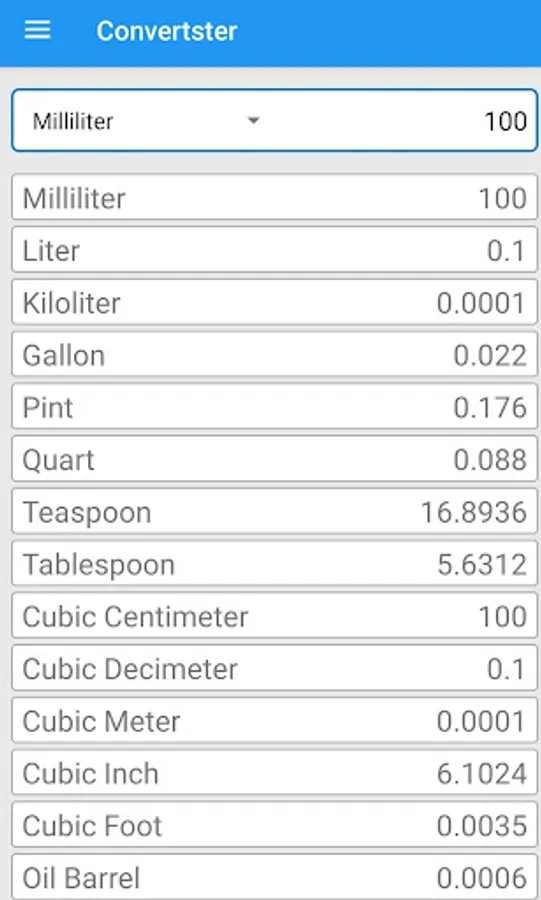 Convert Volume: Milliliter, Liter, Kiloliter, Gallon, Pint, Quart, Teaspoon, Tablespoon, Cubic Centimeter, Cubic Decimeter, Cebic Meter, Cubic Inch, Cubic Foot, Oil Barrel.
