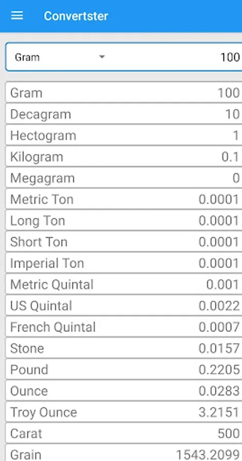 Convert Weight: Femtogram, Picogram, Nanogram, Microgram, Milligram, Centigram, Decigram, Gram, Decagram, Hectogram, Kilogram, Megagram, Metric Ton, Long Ton, Short Ton, Imperial Ton, Metric Quintal, Us Quintal, French Quintal, Stone, Pound, Ounce, Troy Ounce, Carat, Grain, Gold Bar