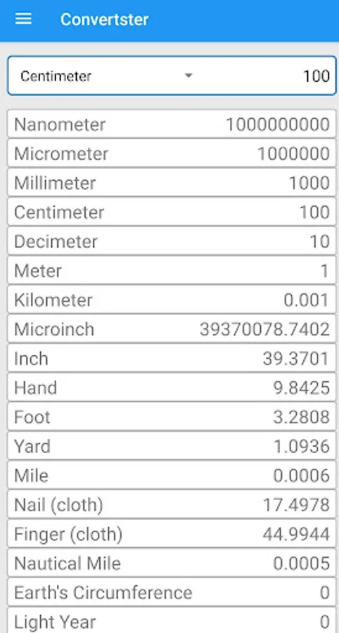 Convert Length: Nanometer, Micrometer, Millimeter, Centimeter, Decimeter, Meter, Kilometer, Microinch, Inch, Hand, Foot, Yard, Mile, Mail (cloth), Finger (cloth), Nautical Mile, Earth’s Circumference, Light Year, Distance to the Sun