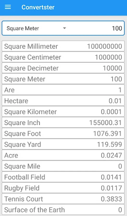 Convert Area: Square Millimeter, Square Centimeter, Square Decimeter, Square Meter, Are, Hectare, Square Kilometer, Square Inch, Square Foot, Square Yard, Acre, Square Mile, Football Field, Rugby Field, Tennis Court, Surface of the Earth