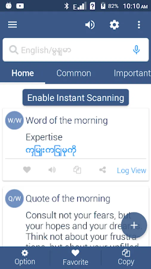 Instant Scanning features: At first you have to enable instant scanning from display settings or home screen , During using browser or any other application please select the word or words and then press copy. You will see instant meaning of this word without opening dictionary.