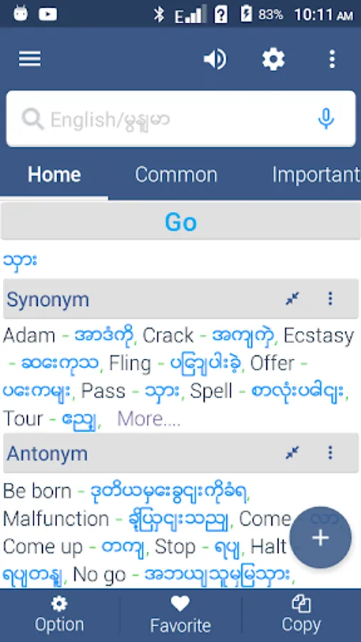 Relevant and important words are listed and synced with search that gives advantage of a word book of Myanmar and English.