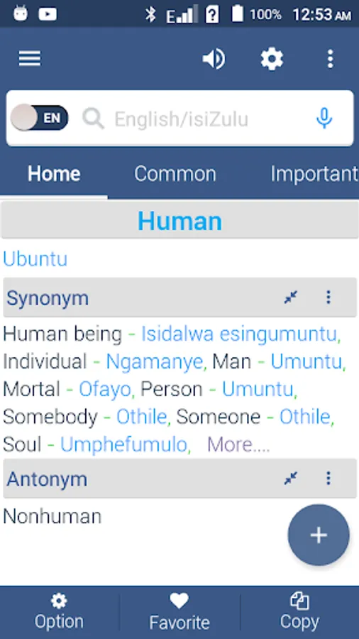 Relavant and important words are listed and synced with search that gives advantage of a word book of Zulu and English.