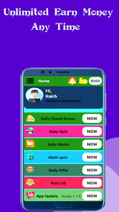 this is earning app in play online. many task and many earn and withdraw your personal cash. many task in apps- Quiz, Reward ads, daily cheek, lucky spin and mini task complete to earn and withdraw. taka income apps bangladesh game, spin, quiz, and more extra get earn
