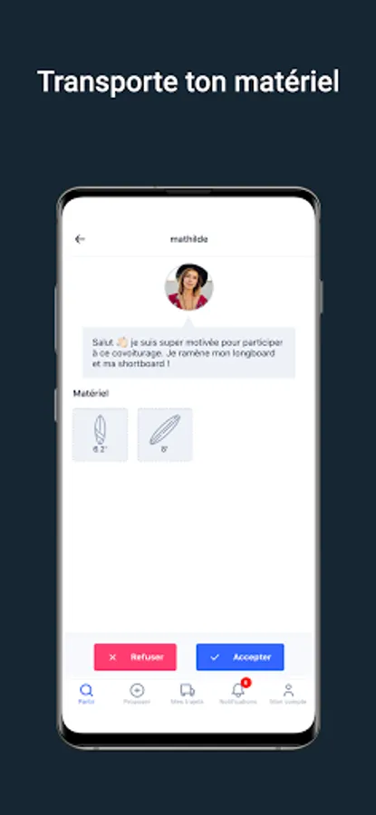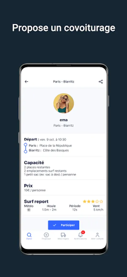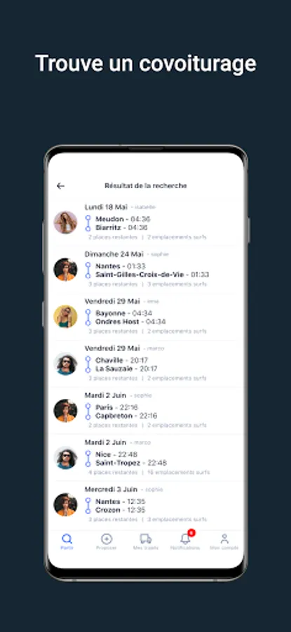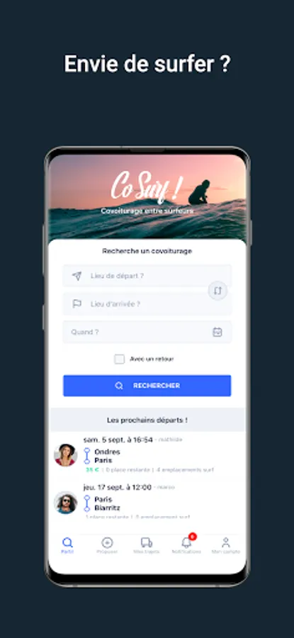 Cosurf is the first carpooling app between surfers. Thanks to Cosurf you can indicate the type of board (s) you wish to transport in carpooling. The Cosurf community is made up of passionate members.