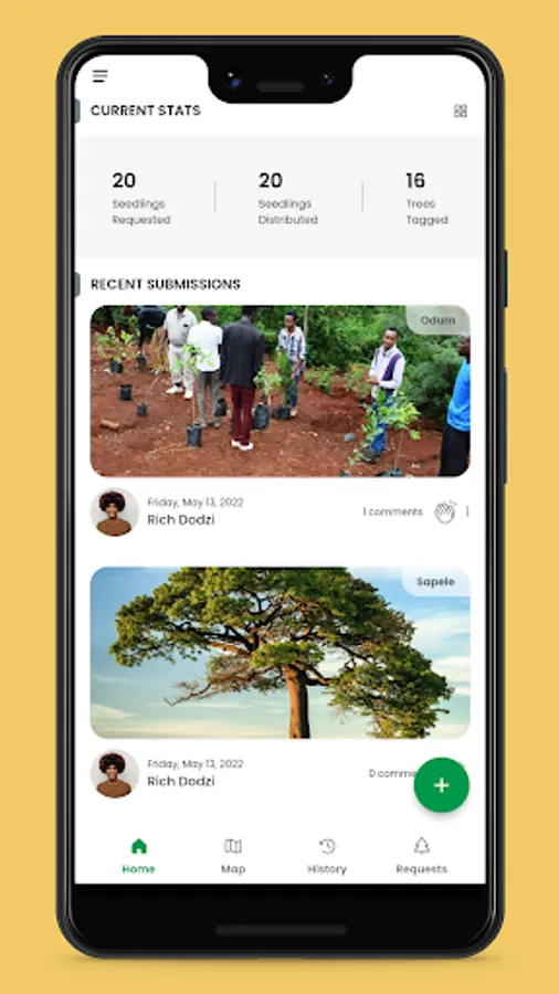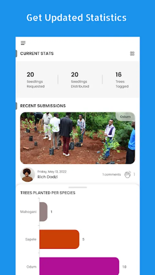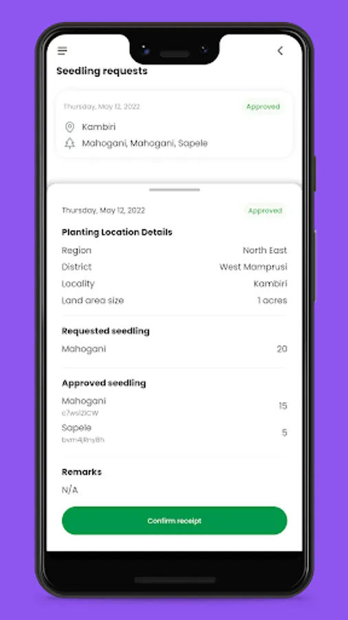 The App's purpose is to facilitate easy seedling requests and monitoring of the planted trees