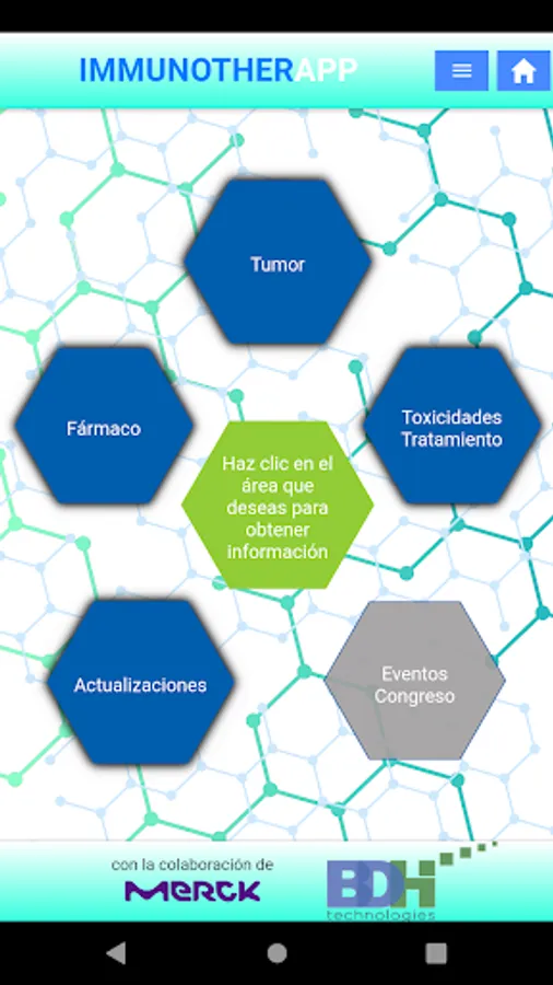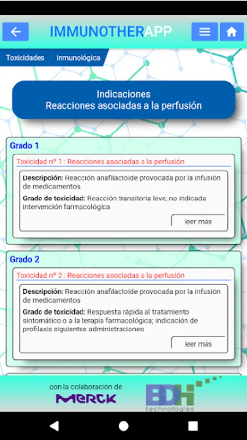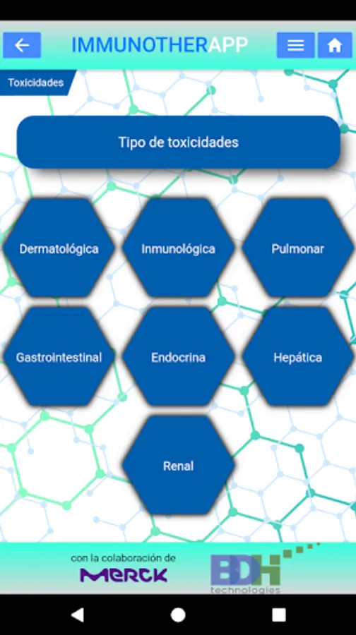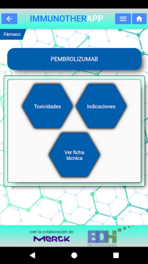 The application allows access to locate the desired information starting from 3 large areas: Drug, Tumor or Toxicity. From here, the specialist will be able to obtain all the necessary information. The navigation through the application is easy and intuitive.
