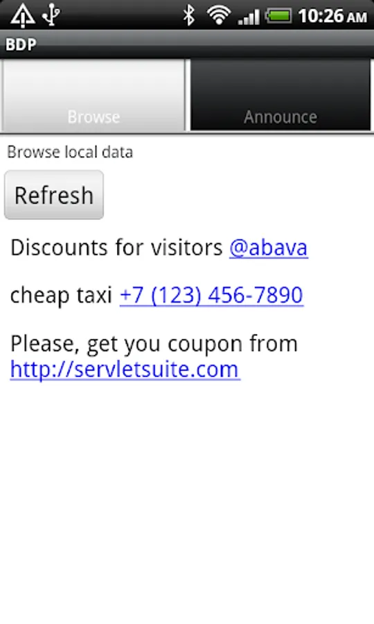 Bluetooth Data Points (BDP) is a new approach for creating mobile services with wireless tags. It is a yet another use case for the network proximity. Mobile application lets any user post some announce (advertising, classified, etc.) and associate it with Bluetooth node on the phone. The same application on another phone can scan nearby Bluetooth nodes and collect local announces. Create a Bluetooth tag from your phone.