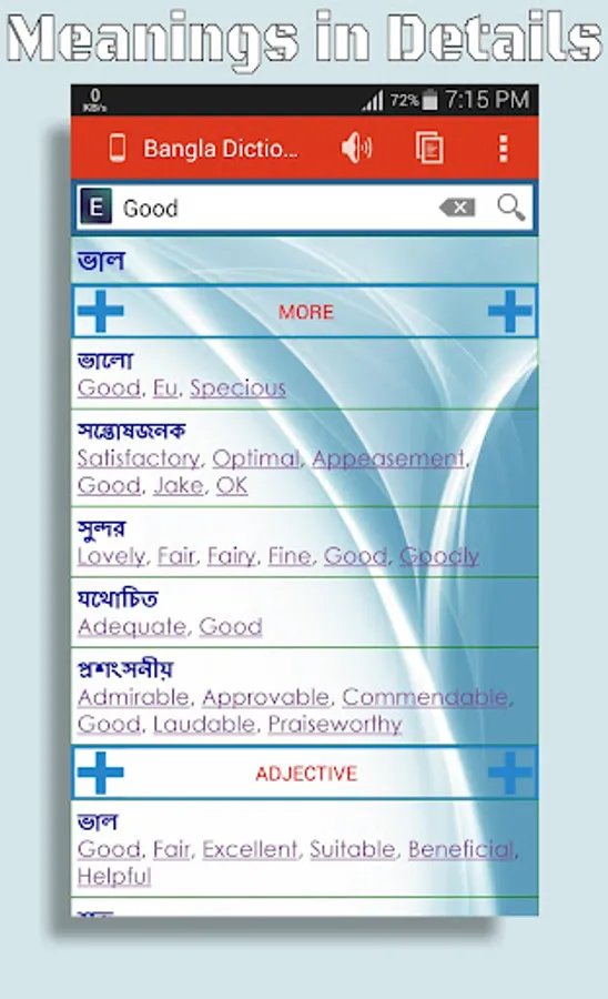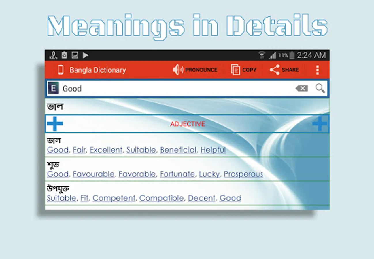 * Get the meanings of a word categorized by Noun, Pronoun, Adjective, Verb, Adverb, Preposition, Suffix, Prefix etc.