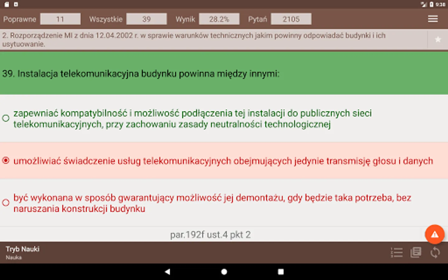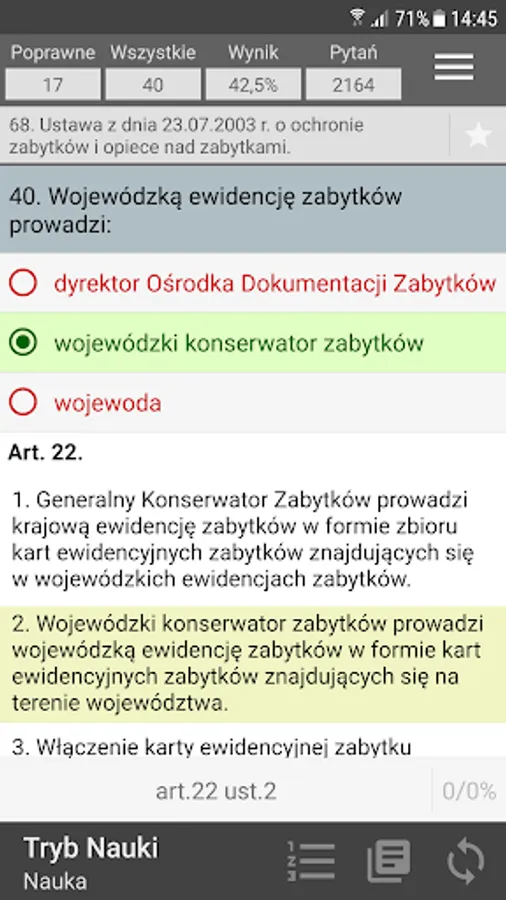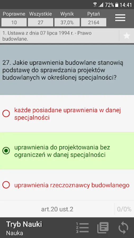 The program indicates the legal basis for the currently selected question, which makes it easier to justify the answer in the applicable regulations. In addition, the most important articles/paragraphs related to the question or answers are highlighted, which allows the user to both know the context of the question and visually quickly remember the correct answer.