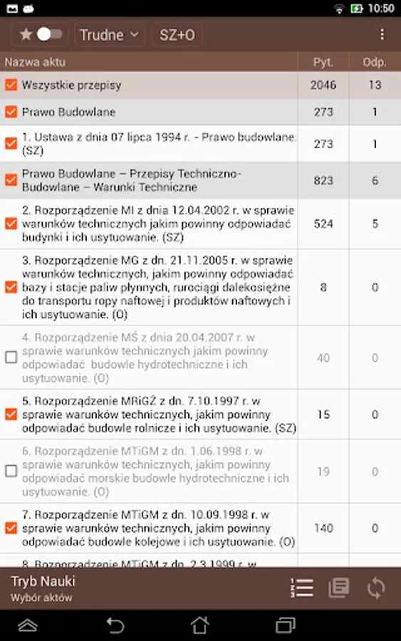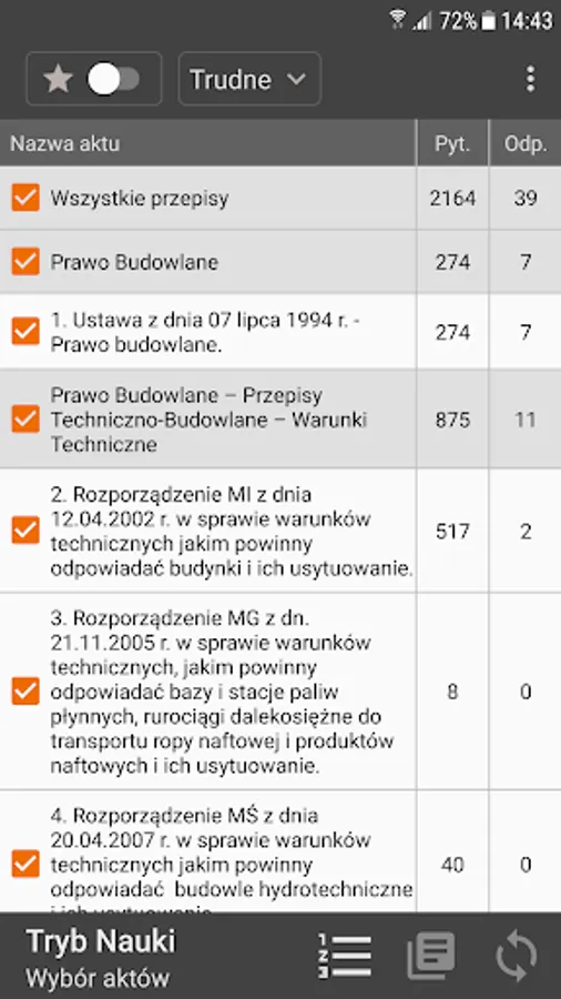 At each stage of learning, it is possible to display a detailed summary showing the number of questions in a given legal act, the number of answers given, the number of correct answers.