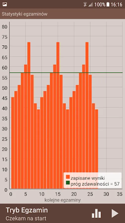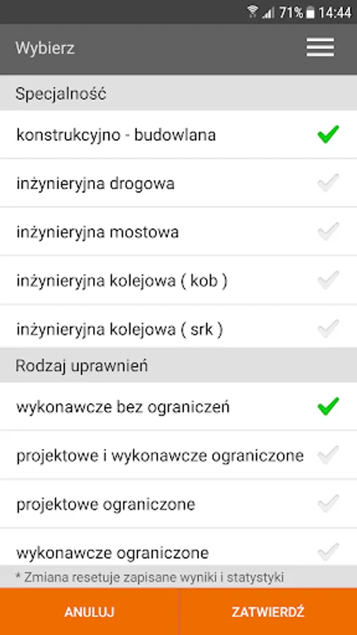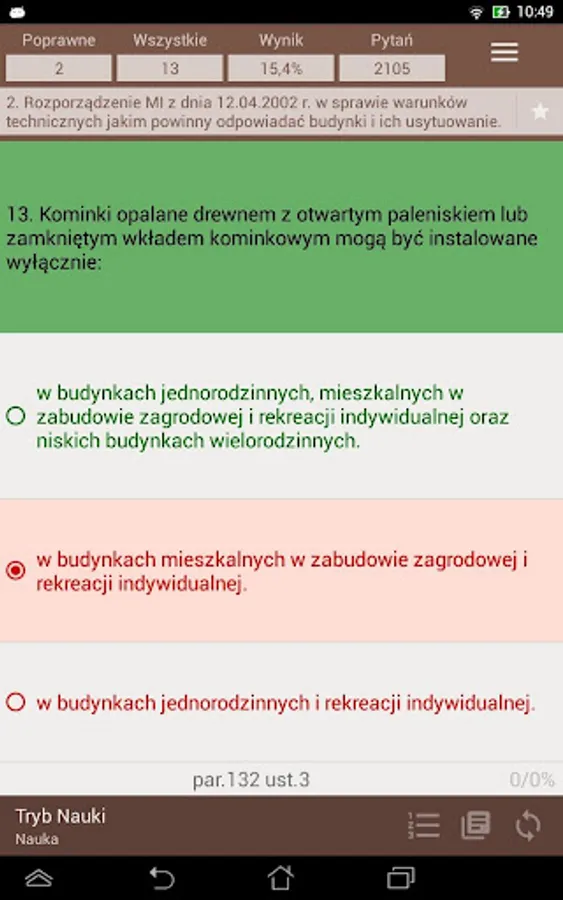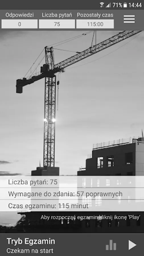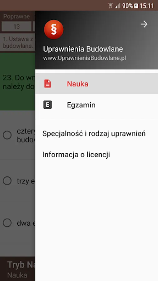 In this mode, the user has the opportunity to test his knowledge gained during learning. The conditions of the exam, such as the number of questions, selection of their scope, duration and the level required to pass the test, were selected based on the Detailed program of exams for building qualifications published by the Polish Chamber of Civil Engineers. It allows you to check and assess the degree of your preparation for the exam very precisely.
